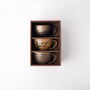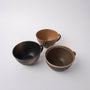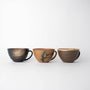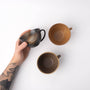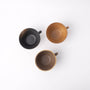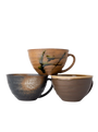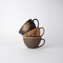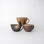 A beautifully curated set of three Japanese ceramic cups, each featuring a unique desert-inspired glaze in earthy tones of black, brown, and toffee. Perfect for coffee, tea, or hot chocolate. Made of porcelain and hand finished in Gifu prefecture, Japan