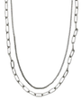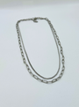 This silver double-layer necklace combines a sleek curb chain with a bold open-link chain for a stylish look. Made from stainless steel and sterling silver, it’s durable, water-resistant, and hypoallergenic—ideal for everyday wear or special occasions. Its PVD coating keeps it shiny and tarnish-free.